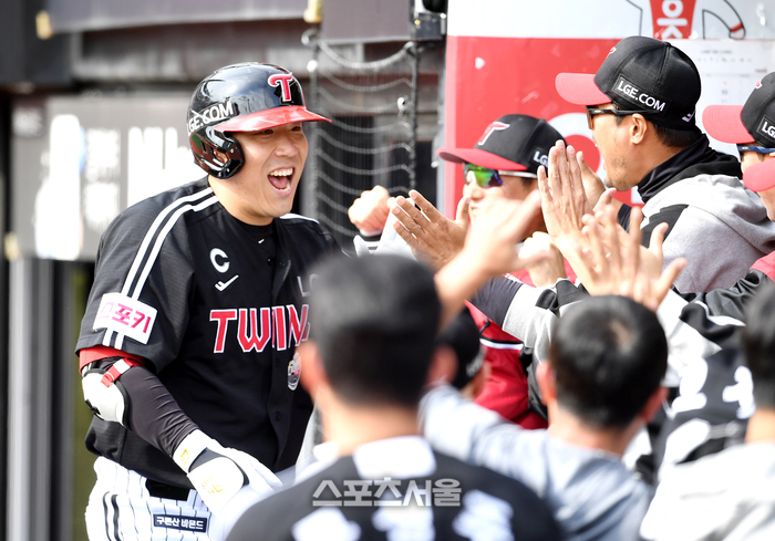 LG 김현수(왼쪽)가 9일 수원 KT위즈파크에서 열린 2024 KBO리그 KT와의 준플레이오프 4차전 2회초 2사 KT 선발 쿠에바스를 상대로 선제 솔로 홈런을 친 뒤 코칭스태프와 하이파이브를 하고 있다. 2024. 10. 9.