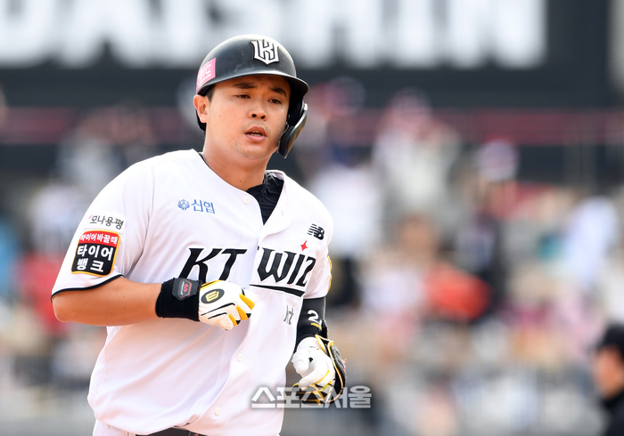 KT 문상철이 9일 수원 KT위즈파크에서 열린 2024 KBO리그 LG와의 준플레이오프 4차전 2회말 무사 LG 선발 엔스를 상대로 추격 솔로 홈런을 친 뒤 베이스를 돌고 있다. 2024. 10. 9.
