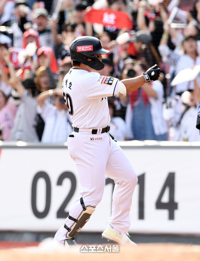 KT 강백호가 9일 수원 KT위즈파크에서 열린 2024 KBO리그 LG와의 준플레이오프 4차전 5회말 무사 LG 김진성을 상대로 솔로 홈런을 친 뒤 뒷걸음질을 치며 더그아웃을 향해 세리머니를 하고 있다. 2024. 10. 9.