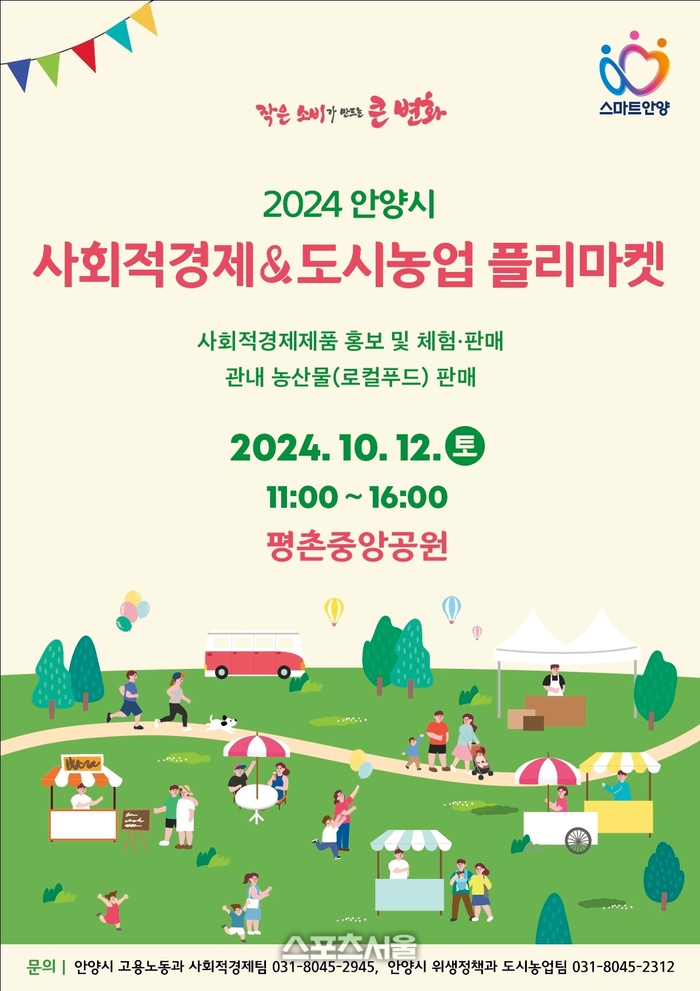 〔스포츠서울│안양=좌승훈기자〕경기 안양시는 오는 12일 오전 11시부터 오후 4시까지 평촌중앙공원에서 ‘사회적경제 & 도시농업 플리마켓’을 진행한다고 10일 밝혔다.