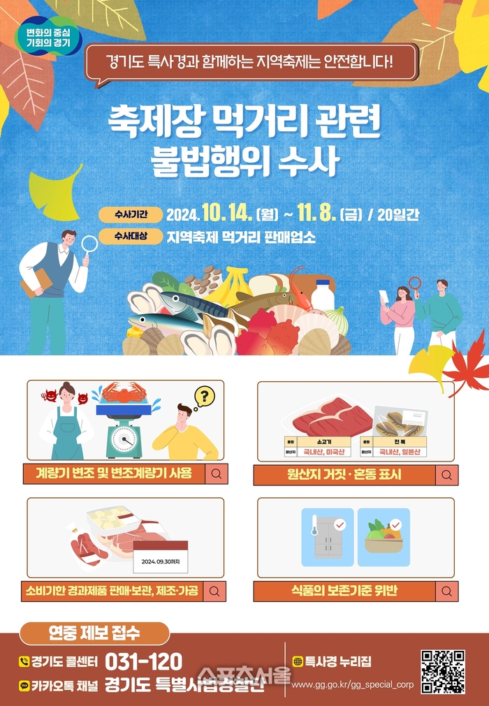 11일 도에 따르면 도 특사경 48명으로 이뤄진 특별수사반은 수원, 고양, 화성 등 축제장 주변 영업장을 방문, 눈속임 계량기 사용 불법행위 등을 수사하고 불법행위 근절을 위해 업주에게 불법행위 유형별 안내문을 제공하고 위험물 ‘핫라인’도 안내한다.