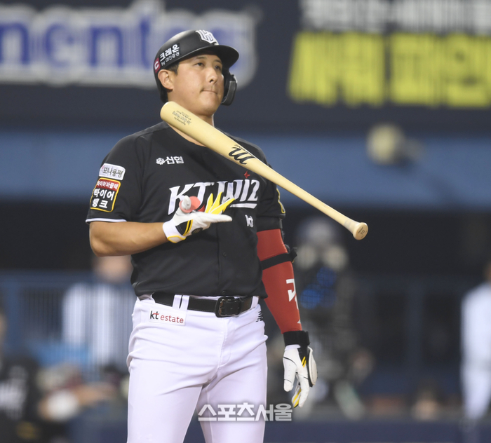 KT 황재균이 11일 잠실야구장에서 열린 LG와 2024 KBO 준플레이오프 5차전 5회말 삼진을 당한 후 아쉬워하고 있다.