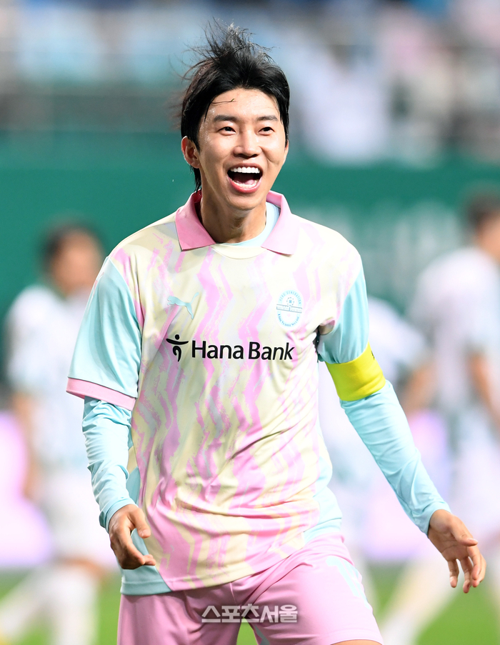 팀 히어로의 가수 임영웅이 12일 대전월드컵경기장에서 열린 팀 기성용과의 하나은행 자선축구대회에서 전원석의 골을 어시스트 한 뒤 함께 기뻐하고 있다. 2024. 10. 12.