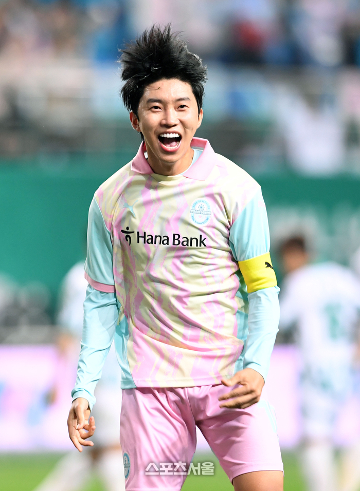 팀 히어로의 가수 임영웅이 12일 대전월드컵경기장에서 열린 팀 기성용과의 하나은행 자선축구대회에서 전원석의 골을 어시스트 한 뒤 기뻐하고 있다. 2024. 10. 12.
