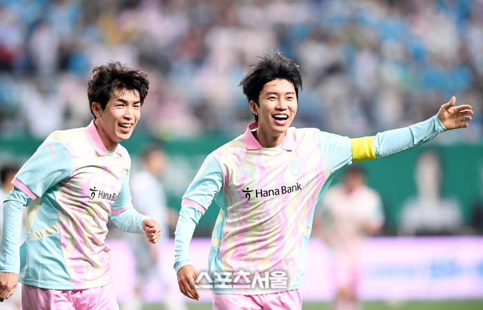 팀 히어로의 가수 임영웅(오른쪽)이 12일 대전월드컵경기장에서 열린 팀 기성용과의 하나은행 자선축구대회에서 전원석의 골을 어시스트 한 뒤 함께 기뻐하고 있다. 2024. 10. 12.