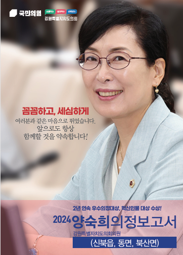 [스포츠서울ㅣ춘천=김기원기자]양숙희 강원특별자치도의원(안전건설위, 춘천6)은 강원특별자치도의원 중 최초로 의정보고서를 제작 완료하고 조만간 지역주민들에게 배포할 계획”이라고 밝혔다.