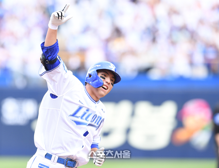 삼성 김영웅이 13일 대구 삼성라이온즈파크에서 열린 2023 KBO리그 LG와의 플레이오프 1차전 4회말 무사 LG 선발 최원태를 상대로 솔로 홈런을 기뻐하고 있다. 2024. 10. 13.