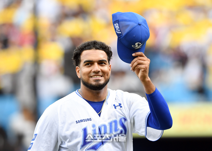 삼성 선발 레예스가 13일 대구 삼성라이온즈파크에서 열린 2023 KBO리그 LG와의 플레이오프 1차전 7회초 2사 1-2루 상황에서 마운드에서 내려가면서 팬들에게 인사를 하고 있다. 2024. 10. 13.
