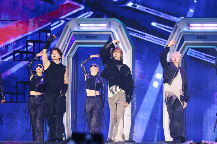 마지막 날인 13일 오후 5시, 화려한 폭죽과 함께 공연의 막이 올랐다. 리프트를 타고 등장한 세븐틴은 ‘독 : 피어’와 ‘피어리스’, ‘마에스트로’로 이어지는 퍼포먼스를 통해 두려움에 잠식됐던 지난날을 이겨내고 자신의 존재를 증명하는 과정을 표현했다. 스타디움 규모에 걸맞은 웅장한 연출과 무대를 유기적으로 잇는 서사가 돋보였다.