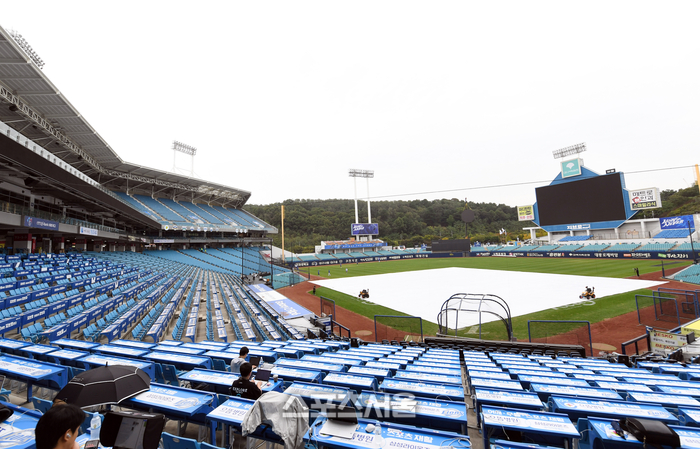 14일 대구 삼성라이온즈파크에서 열리는 2023 KBO리그 삼성과 LG의 플레이오프 2차전에 앞서 비가 예고된 가운데 그라운드 위로 대형 방수포가 덮혀 있다. 2024. 10. 14.