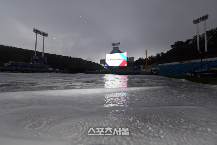 14일 대구 삼성라이온즈파크에서 열릴 예정이던 2023 KBO리그 삼성과 LG의 플레이오프 2차전이 우천 순연된 가운데 안내 메시지가 전광판에 표출되고 있다. 2024. 10. 14.