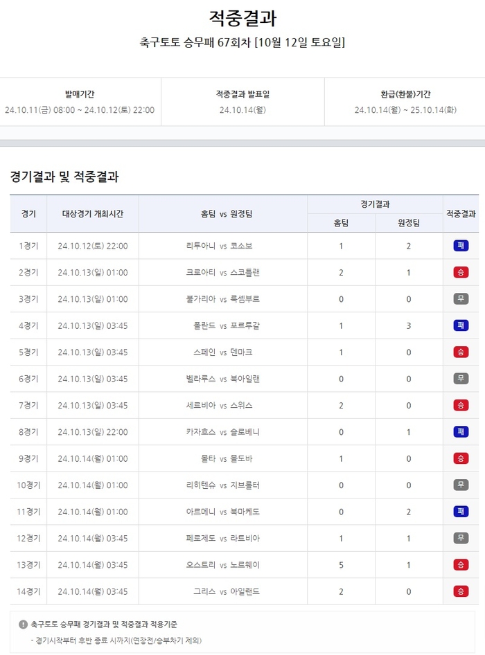 [스포츠서울 | 김동영 기자] 국민체육진흥공단이 발행하는 체육진흥투표권 스포츠토토의 수탁사업자 스포츠토토코리아가 지난 12일부터 14일까지 진행된 2024-2025 UEFA 네이션스리그 14경기를 대상으로 하는 축구토토 승무패 67회차 게임에서 1등 적중이 23건 발생했다고 14일 밝혔다.