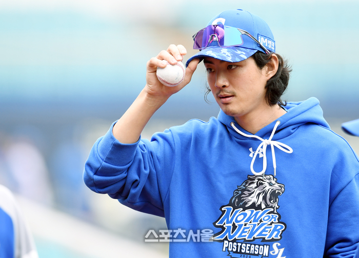 삼성 구자욱이 15일 대구 삼성라이온즈파크에서 열리는 2024 KBO리그 LG와의 플레이오프 2차전에 앞서 훈련을 위해 그라운드로 나서고 있다. 2024. 10. 15.
