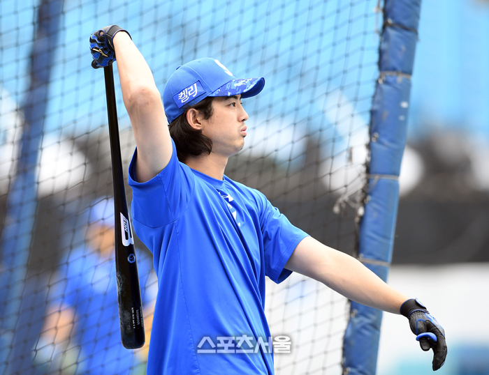 삼성 구자욱이 15일 대구 삼성라이온즈파크에서 열리는 2024 KBO리그 LG와의 플레이오프 2차전에 앞서 타격 훈련을 하고 있다. 2024. 10. 15.