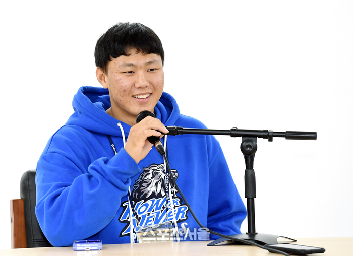 2025 신인드래프트 1라운드 삼성 지명 선수인 배찬승이 15일 대구 삼성라이온즈파크에서 열리는 2024 KBO리그 삼성과 LG의 플레이오프 2차전에 앞서 취재진과 인터뷰를 하고 있다. 2024. 10. 15.