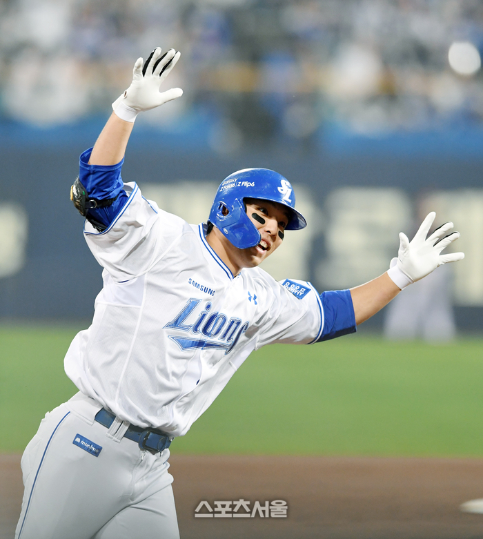 삼성 김영웅이 15일 대구 삼성라이온즈파크에서 열린 2024 KBO리그 LG와의 플레이오프 2차전 2회말 2사 LG 선발 손주영을 상대로 솔로 홈런을 치고 기뻐하고 있다. 2024. 10. 15.