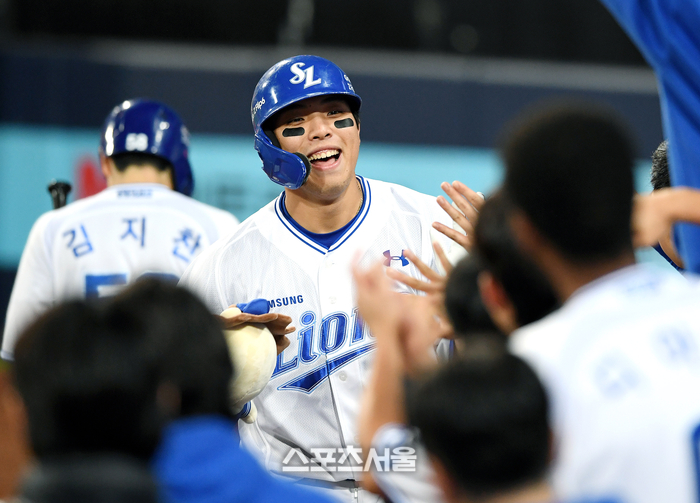 삼성 김영웅이 15일 대구 삼성라이온즈파크에서 열린 2024 KBO리그 LG와의 플레이오프 2차전 2회말 2사 LG 선발 손주영을 상대로 솔로 홈런을 치고 동료들과 하이파이브를 하고 있다. 2024. 10. 15.