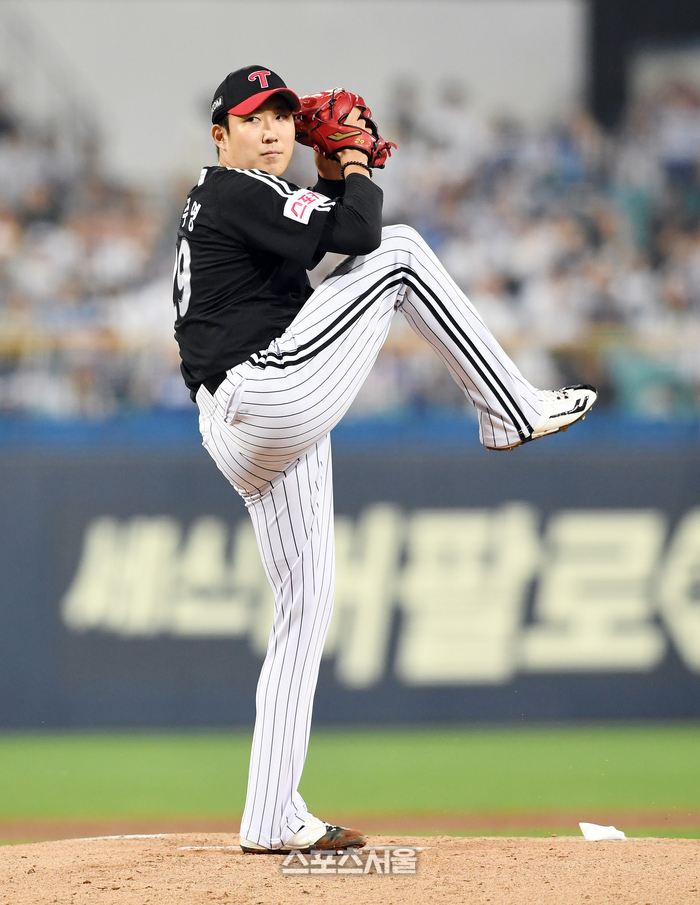LG 손주영이 15일 대구 삼성라이온즈파크에서 열린 2024 KBO리그 삼성과의 플레이오프 2차전에 선발 등판해 힘차게 공을 던지고 있다. 2024. 10. 15.
