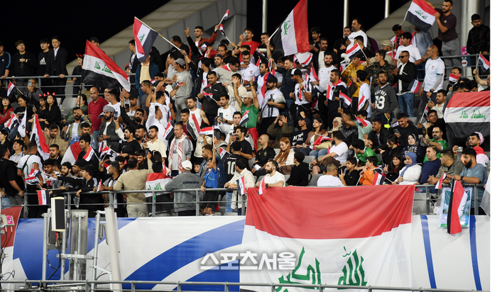 이라크 응원단이 15일 용인 미르스타디움에서 열린 2026 FIFA 북중미 월드컵 아시아 3차 예선 한국과 경기에 앞서 응원을 하고 있다.