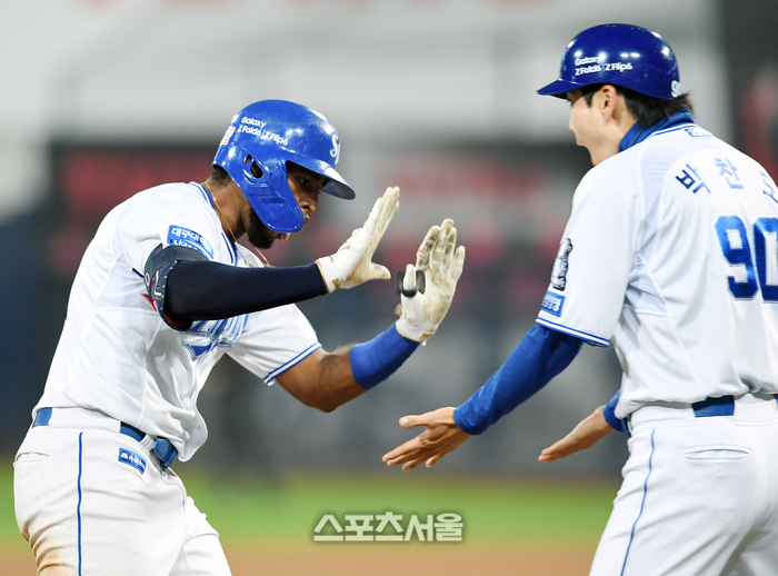 삼성 디아즈가 15일 대구 삼성라이온즈파크에서 열린 2024 KBO리그 LG와의 플레이오프 2차전 6회말 무사 LG 함덕주를 상대로 솔로 홈런을 치고 박찬도 코치와 하이파이브를 하고 있다. 2024. 10. 15.