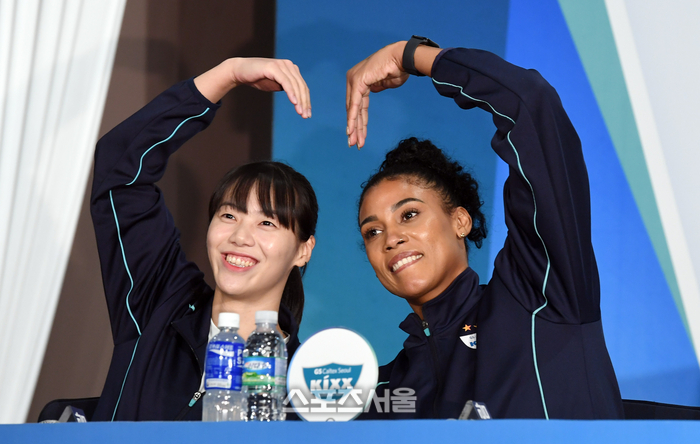 GS칼텍스 유서연(왼쪽)과 실바가 16일 서울 서초구 더케이호텔에서 진행된 도드람 2024-2025 V-리그 여자부 미디어데이 행사에서 함께 세리머니를 선보이고 있다. 2024. 10. 16.