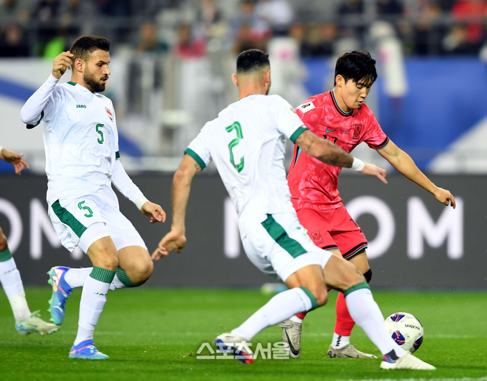 이들 모두 북중미 세대의 리더로 떠오른 이강인(23·파리 생제르맹)과 더불어 장기 비전을 지닌 자원이다. ‘이강인과 아이들’이라는 시선도 따른다. 손흥민이 허벅지 부상으로 빠진 2연전에서 이강인은 왜 대표팀의 간판인지 증명했다. 일각에서는 그가 상대 집중 견제에 꽁꽁 묶였다고 보지만 들여다보면 그렇지 않다. 홍 감독이 내세운 변형 스리백에서 오른쪽 윙어를 맡은 그는 상대 2~3명을 끌고 다니며 전진한 풀백 설영우에게 공간을 자주 만들어냈다. 요르단전 이재성의 헤더 결승골을 도운 설영우의 크로스도 이런 장면에서 만들어졌다. 이라크전에서도 그가 현란한 드리블로 상대를 유린하고 전환 패스를 통해 배준호, 이재성에게 기회를 제공했다. 공격 포인트 없이 경기 MOM(맨 오브 더 매치)에 선정된 이유다.