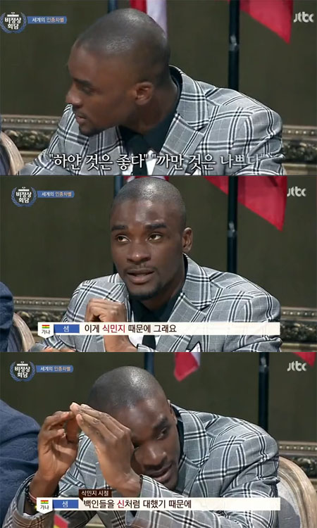 이날 방송에서 샘 오취리는"어렸을 때 가나 학교에서 '하얀 것은 좋다. 까만 것은 나쁘다'고 배웠다"라고 말해 충격을 안겼다. 이어 그는 "이것은 식민지 때문에 그렇다. 식민지 시절 백인을 신처럼 대했다. 현재도 가나에서 많은 사람들이 조금이라도 피부가 더 하얀 사람은 선호한다"고 밝혔다.