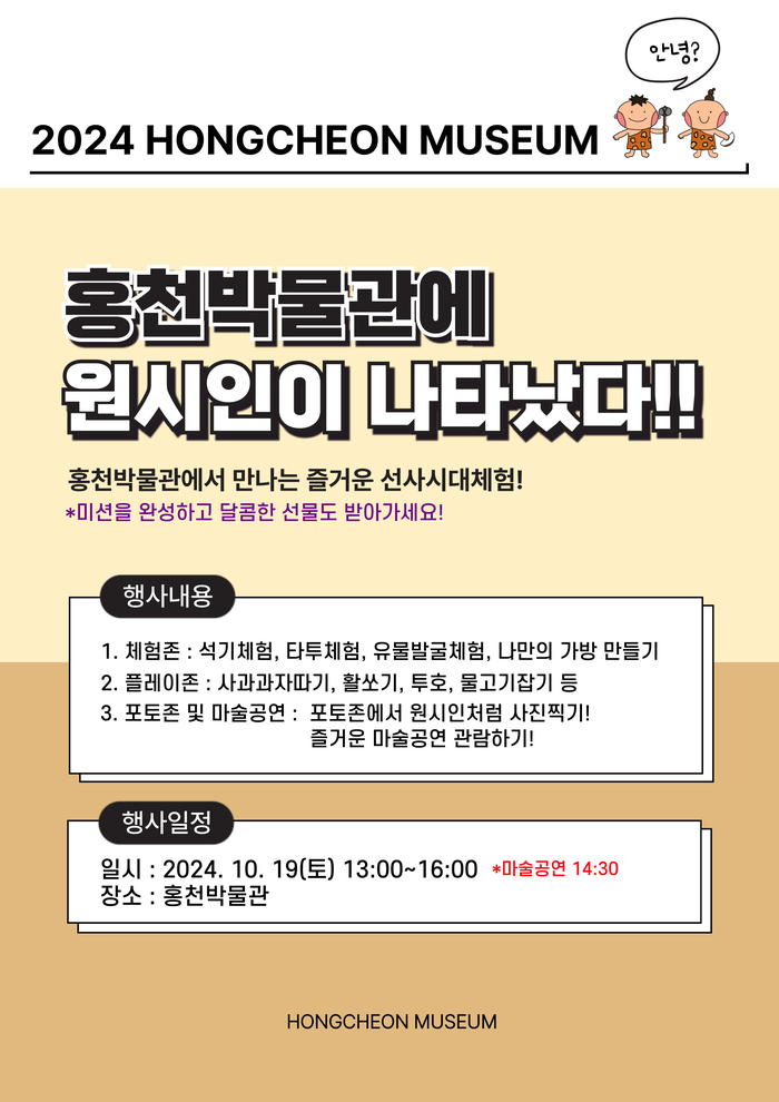 [스포츠서울ㅣ김기원기자]홍천박물관은 오는 19일 ‘홍천박물관에 원시인이 나타났다!!’는 주제로 교육문화체험전을 진행한다.