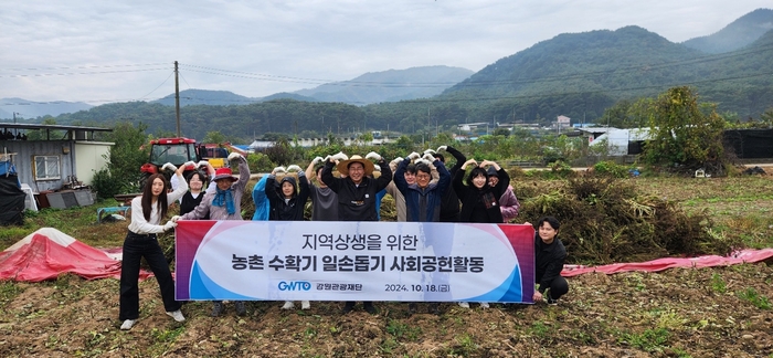 [스포츠서울ㅣ춘천=김기원기자]강원관광재단(대표이사 최성현, 이하 ‘재단’)은 10월 18일, 일손 부족으로 어려움을 겪고 있는 춘천시 서면의 농가를 방문하여 인삼밭의 차광막 제거 및 작물 수확 작업을 지원하는 농촌일손돕기 사회공헌활동을 진행했다고 밝혔다