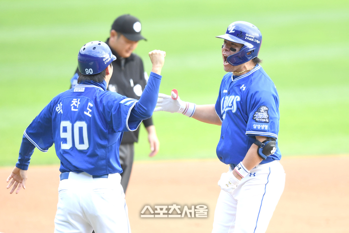 삼성 강민호가 19일 잠실야구장에서 열린 LG와 2024 KBO 플레이오프 4차전 8회초 좌중월 홈런을 날린 후 환호하고 있다.