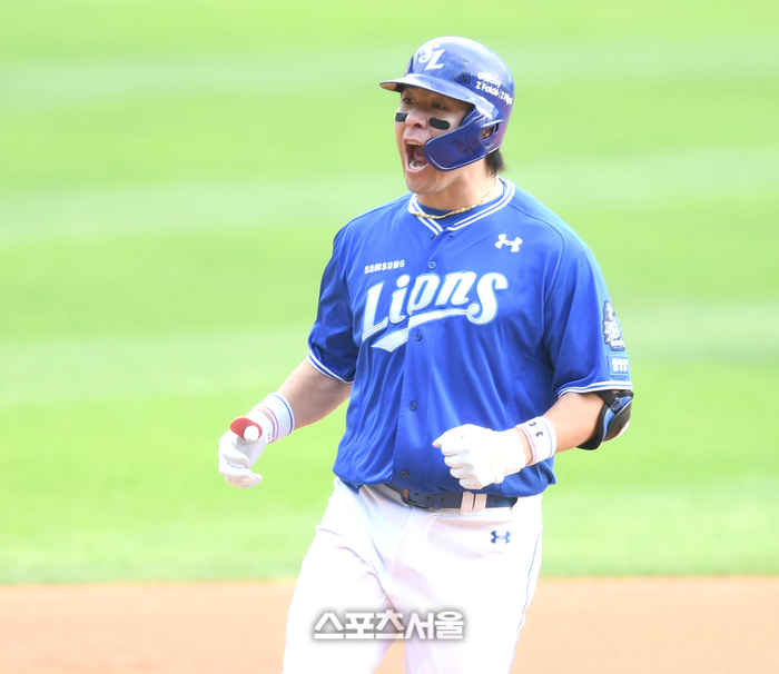 삼성 강민호가 19일 잠실야구장에서 열린 LG와 2024 KBO 플레이오프 4차전 8회초 좌중월 홈런을 날린 후 환호하고 있다.