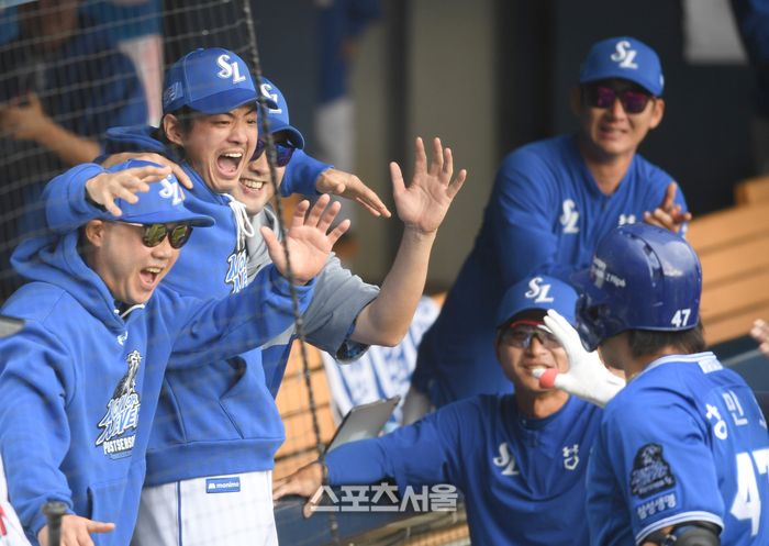 삼성 강민호가 19일 잠실야구장에서 열린 LG와 2024 KBO 플레이오프 4차전 8회초 좌중월 홈런을 날린 후 박진만 감독, 구자욱과 하이파이브를 하고 있다.