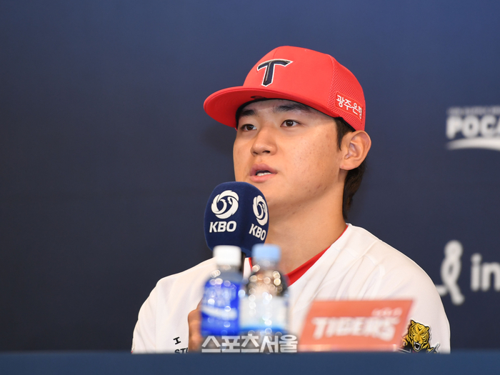 김도영은 20일 20일 광주 라마다플라자 바이 윈덤 충장 호텔 라벤더홀에서 열린 2024 KBO 한국시리즈 미디어데이에서 “정규시즌 부상 없이 열심히 달려왔다. 젊은 패기로, 한국시리즈 영광이라는 생각으로, 우승까지 갈 수 있게 팀에 보탬이 되겠다”고 각오를 다졌다.