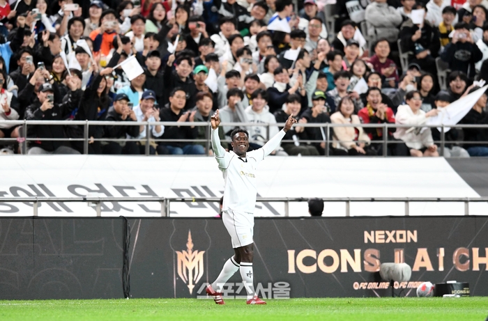 클라렌스 세이도르프가 20일 서울월드컵경기장에서 열린 FC 스피어와 쉴드 유나이티드의 ‘2024 넥슨 아이콘 매치’에서 추가골을 넣은 뒤 기뻐하고 있다. 2024. 10. 20.