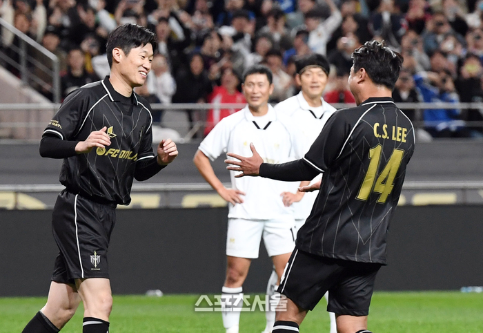박지성(왼쪽)이 20일 서울월드컵경기장에서 열린 FC 스피어와 쉴드 유나이티드의 ‘2024 넥슨 아이콘 매치’에서 페널티킥으로 골을 넣은 뒤 이천수와 하이파이브를 나누고 있다. 2024. 10. 20.