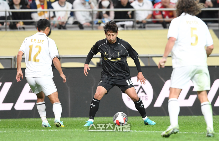 이천수(가운데)가 20일 서울월드컵경기장에서 열린 FC 스피어와 쉴드 유나이티드의 ‘2024 넥슨 아이콘 매치’에서 이영표(왼쪽)와 푸욜 사이로 돌파를 시도하고 있다. 2024. 10. 20.