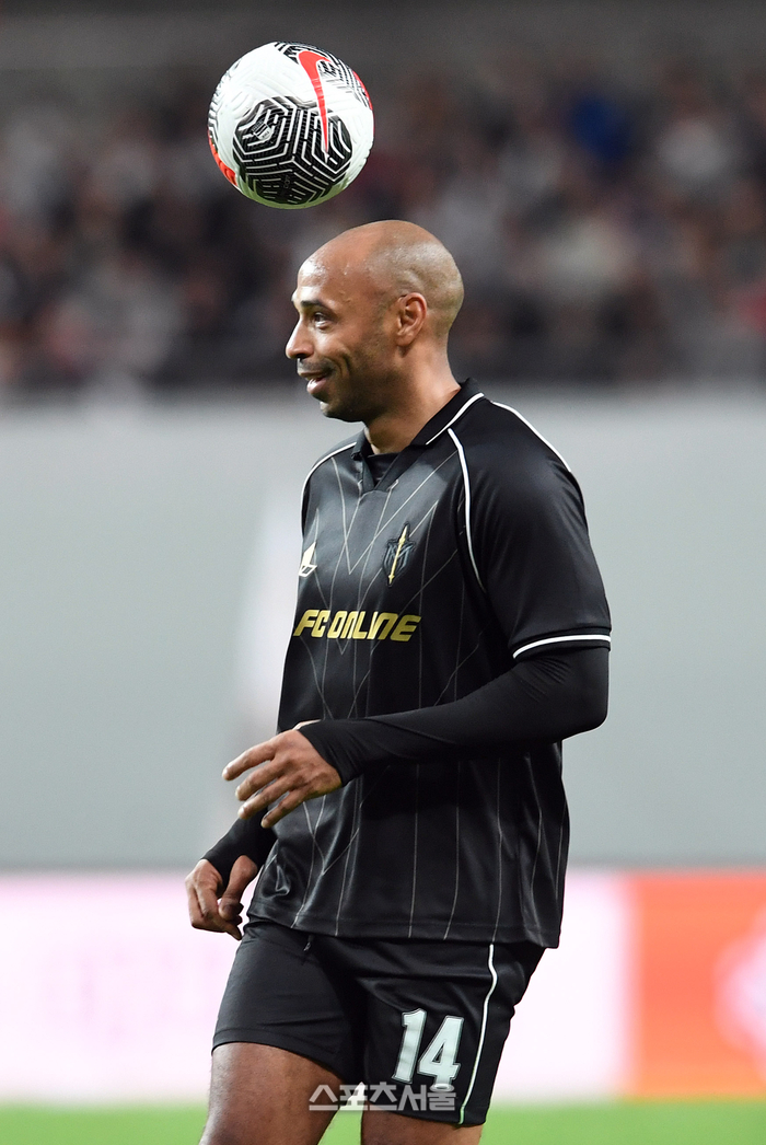 티에리 앙리가 20일 서울월드컵경기장에서 열린 FC 스피어와 쉴드 유나이티드의 ‘2024 넥슨 아이콘 매치’에서 머리로 공을 다루고 있다. 2024. 10. 20.
