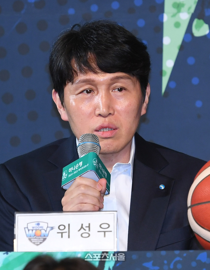 우리은행 위성우 감독이 21일 서울 중구 더 플라자호텔에서 진행된 하나은행 2024-2025 여자프로농구 개막 미디어데이 행사에서 시즌 각오를 밝히고 있다. 2024. 10. 21.
