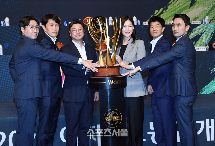 21일 서울 중구 더 플라자호텔에서 진행된 하나은행 2024-2025 여자프로농구 개막 미디어데이 행사에서 각 팀 감독들이 기념촬영을 하고 있다. 왼쪽부터 KB스타즈 김완수 감독, 우리은행 위성우 감독, 하나은행 김도완 감독, BNK 썸 김정은 감독, 삼성생명 하상윤 감독, 신한은행 구나단 감독. 2024. 10. 21.