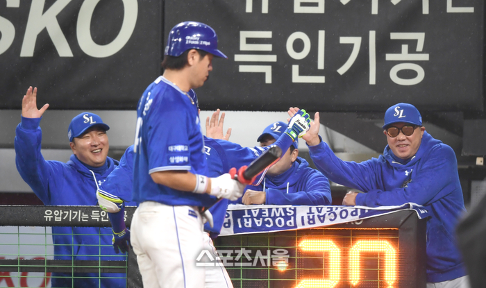 삼성 김헌곤이 21일 광주기아챔피언스필드에서 열린 KIA와 2024 KBO 한국시리즈 1차전 6회초 우월홈런을 날린 후 박진만 감독과 하이파이브를 하고 있다.
