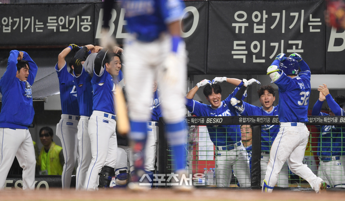 삼성 김헌곤이 21일 광주기아챔피언스필드에서 열린 KIA와 2024 KBO 한국시리즈 1차전 6회초 우월홈런을 날린 후 동료들과 환호하고 있다.