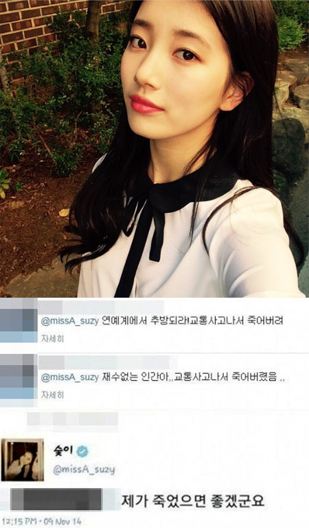 한편, 지난 11월 A씨는 트위터를 통해 수지에게 "재수없는 인간아, 교통사고 나서 죽어버렸라", "연예계에서 추방되라" 등의 악성글을 남겼다. 이에 수지는 "제가 죽었으면 좋겠군요"라고 댓글을 달아 논란이 커졌다.