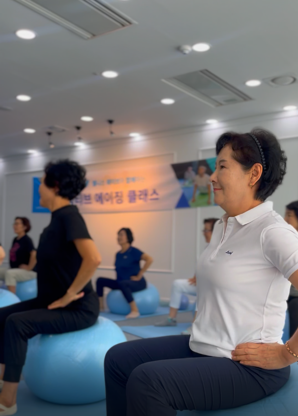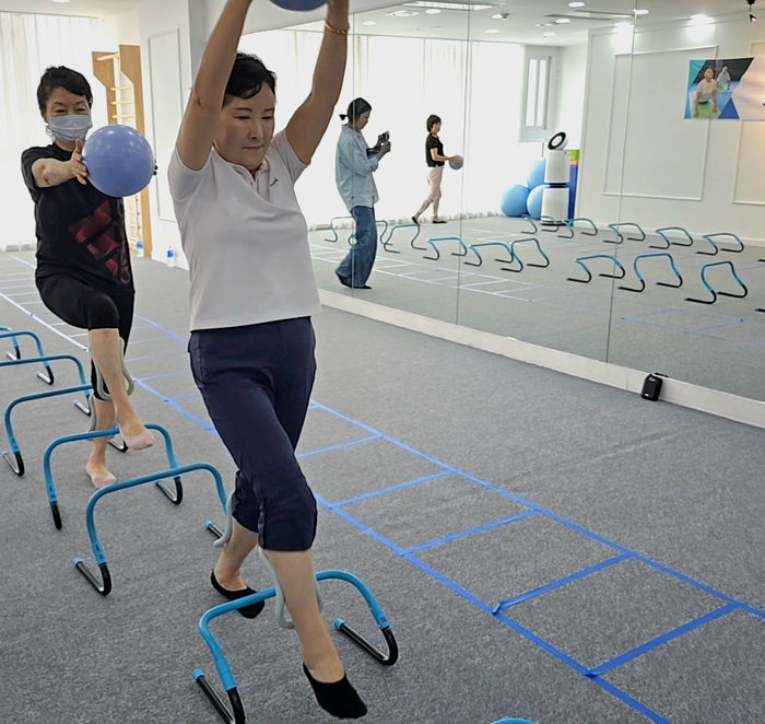 필라테스는 호흡과 코어를 통해 뼈와 관절, 속근육을 활성화하고 척추의 유연성을 강화하는 운동이다. 고령층 참여율이 높아지면서 ‘실버 필라테스’로 구분해 전문적인 강사진을 늘리는 추세란다. 김 이사는 “젊은 회원은 대부분 대기구를 사용한다. 반면 고령층은 소도구를 병행하게 한다. 엉덩이를 들어올리는 브릿지 동작을 예로 들면 엉덩이와 내전근에 힘을 줘야 하는데 고령자에겐 관절 등에 무리가 올 수 있다. 그래서 미니볼을 껴서 자극을 잘 느낄 수 있게 돕는다”고 말했다.