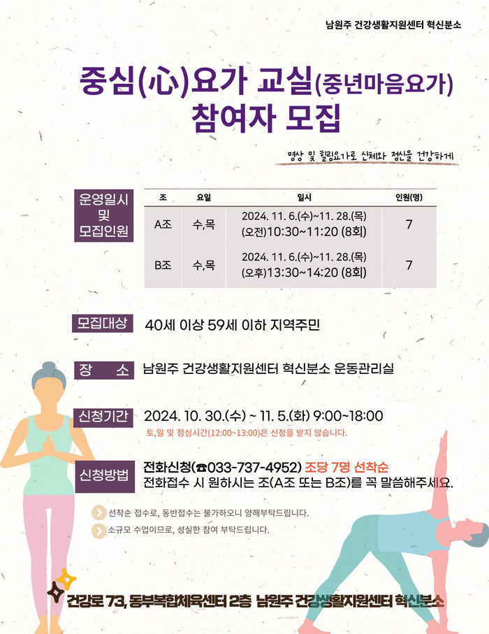 [스포츠서울ㅣ원주=김기원기자]남원주건강생활지원센터 혁신분소는 오는 30일부터 ‘중심(心)요가 교실-중년마음요가’ 참여자를 모집한다.