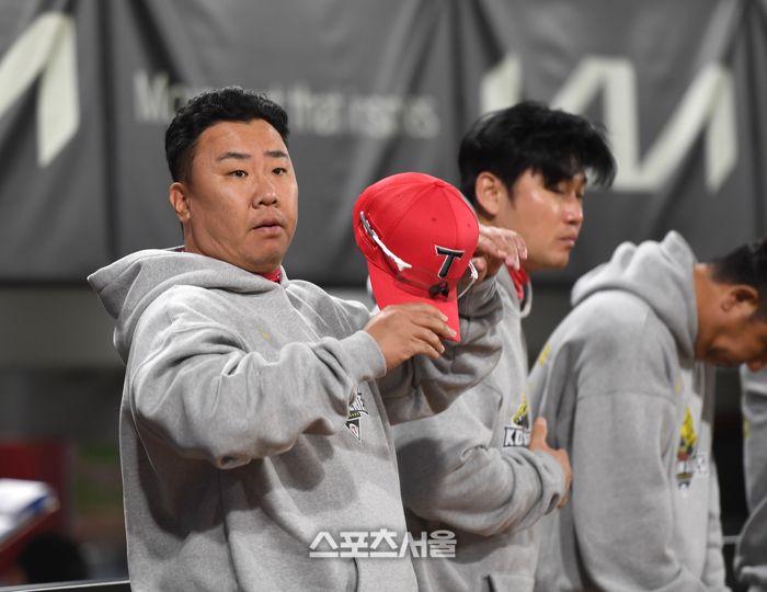 KIA 이범호 감독이 23일 광주기아챔피언스필드에서 열린 삼성과 2024 KBO 한국시리즈 2차전 시작 전 상대 덕아웃을 바라보고 있다.