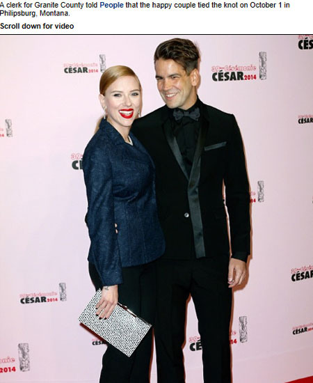 1일(현지시간) 미국 '피플' 등 주요 외신들은 "스칼렛 요한슨이 지난 10월 1일 미국 몬타나 주 필립스버그에서 로메인 도리악과 결혼식을 올렸다"고 보도했다.