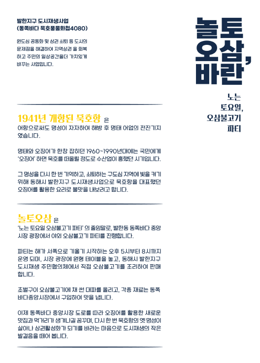 발한지구 도시재생주민협의체는 과거 묵호를 대표했던 오징어를 활용한 먹거리 행사를 추진함으로써 쇠퇴하고 있는 지역상권을 다시살리는 실질적인 경제행사로 만들고자 한다.