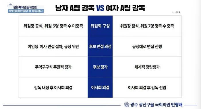 민 의원은 “문체부 현안질의 이후 감독 선임의 공정성이 회복됐다. 이전에는 왜 안 됐는지를 묻는 것”이라고 물었다. 정 회장은 “10차 전력강화위원회 이후에 추천이 사실상 끝이 났고 이 이사가 계약을 위한 절차를 했다. 마지막 주관적 평가는 전강위에서 충분한 토의를 했다고 생각한다”라고 주장했다.