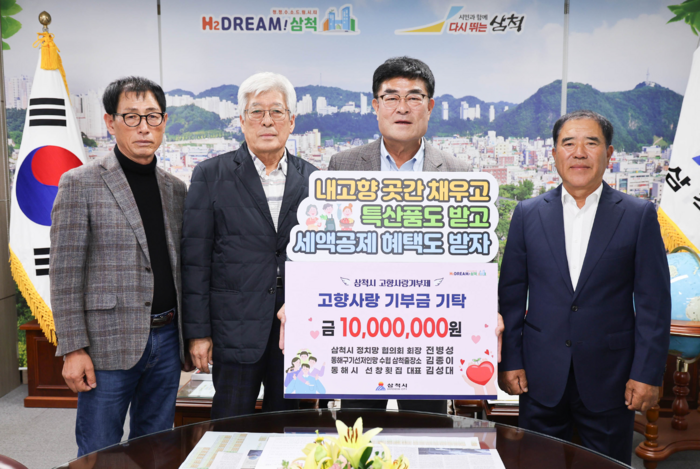 [스포츠서울ㅣ김기원기자]삼척시는 삼척시정치망협의회 전병성 회장, 동해 선창횟집 김성대 대표, 동해구기선저인망수협삼척출장소 김종이님이 고향사랑기부금으로 1천만 원을 기탁했다고 밝혔다.
