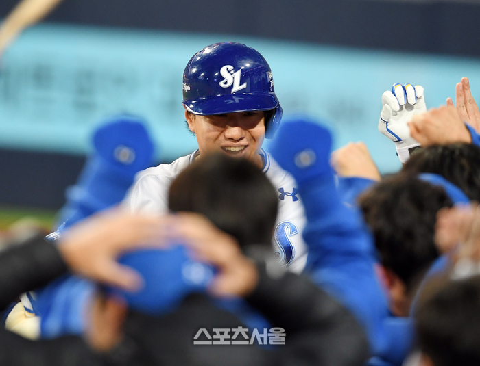 삼성 이성규가 25일 대구 삼성라이온즈파크에서 열린 2024 KBO리그 KIA와의 한국시리즈 3차전 3회말 무사 KIA 선발 라우어를 상대로 선제 솔로 홈런을 친 뒤 기뻐하고 있다. 2024. 10. 25.